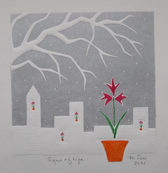 Medium: Linocut, embossing, watercolor