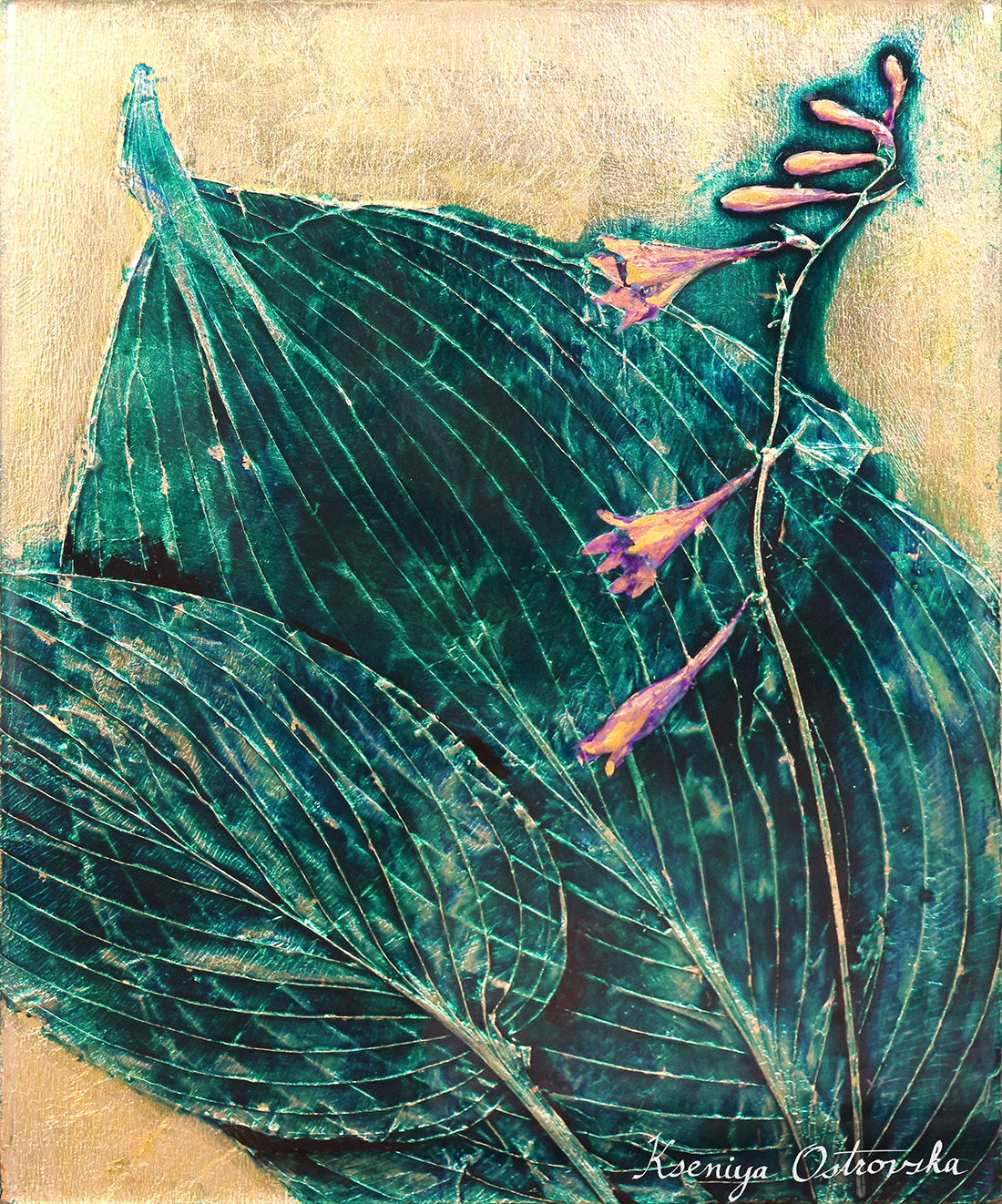 Medium: Pressed botanicals, gold leaf, acrylic, resin
