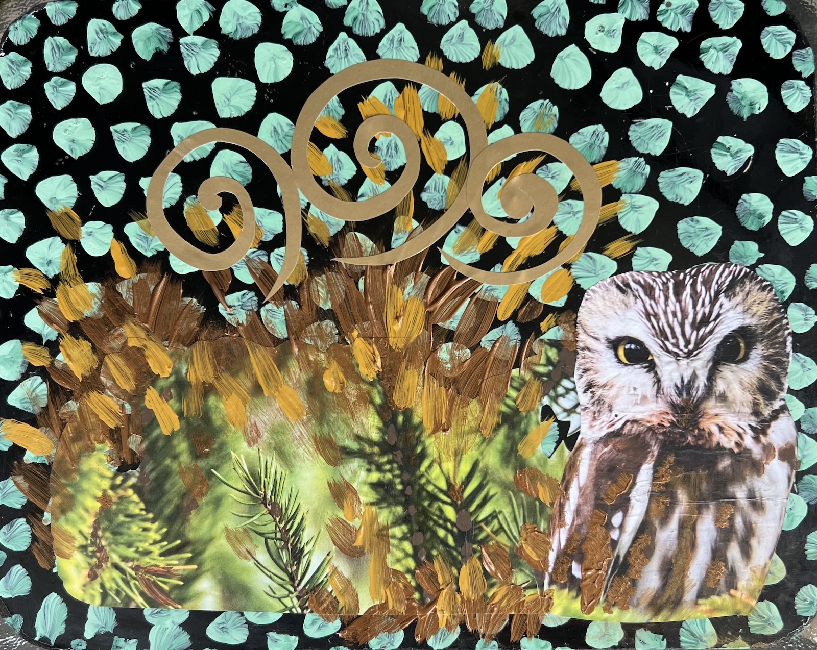 Medium: Mixed media collage of cardboard, paper, paint, glue & varnish
